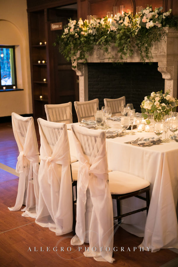 The ceremony was held in the mansion’s glass conservatory which provided stunning natural light streaming in from every angle. As guests transitioned from an intimate cocktail hour to the reception, they sat down at candlelit tables lined with sheer ivory runners, graceful ivory chair drapes and elegant florals by Karla Kassidy Designs. As a pop of pattern we added the prettiest floral damask napkins from BBJ Linen with a personalized marble place stones by Haley Tyson Designs to accent each place setting and bring a bit of modern flair.